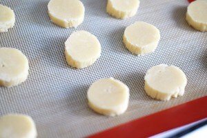 4. 天板にオーブン用のシートを敷き、厚さ1cmほどの輪切りにした生地を並べて、オーブンで焼いたら完成です!