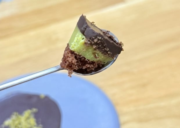上から滑らかなチョコ→サクサクのカダイフ→香り高いピスタチオチョコ→しっとりふわふわのパウンド生地と、層ごとに味わいも食感も違うのが印象的!