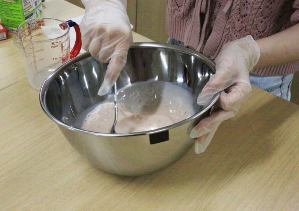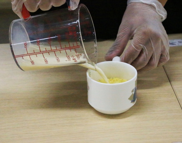 2.カップに豆乳を少しずつ混ぜながら加えます。