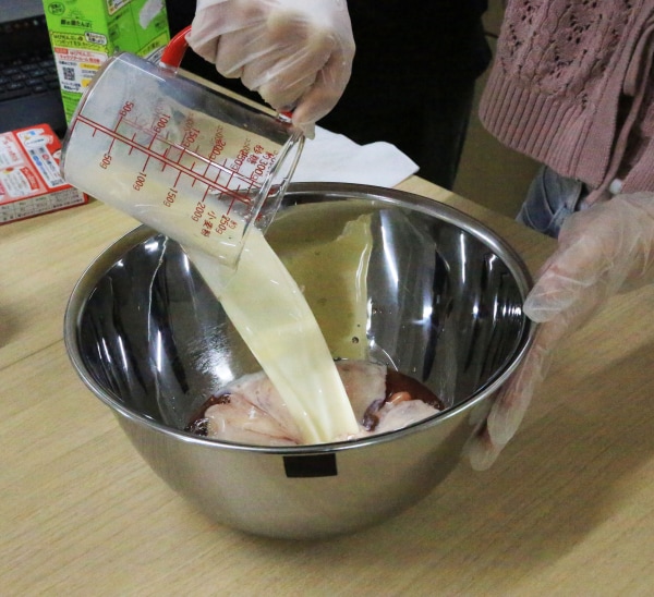 2.よく冷えた豆乳200mlを、1回で加えます。