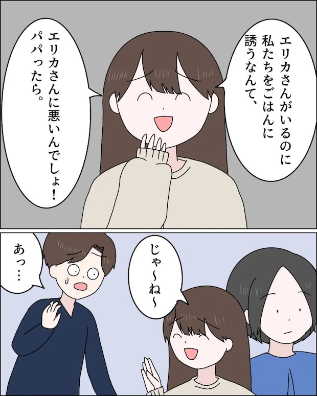 「エリカさんがいるのに私たちをごはんに誘うなんて、エリカさんに悪いでしょ!パパったら」ジュリちゃんはそう言ってケイさんを軽くあしらうと、「あっ・・」とまだ何か言いたげなケイさんを残して「じゃ~ね~」とリナさんとカンタくんと歩いて行ってしまいました。