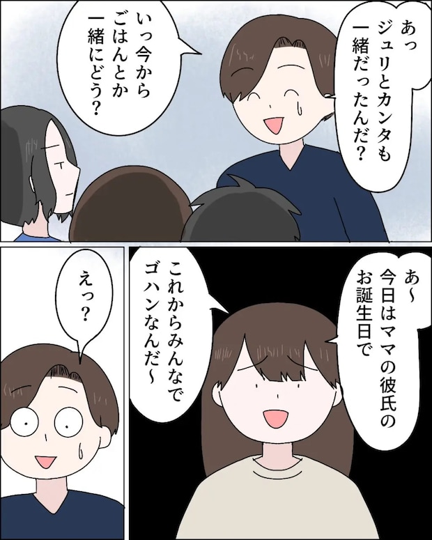 「あっ。ジュリとカンタも一緒だったんだ?いっ、今からごはんとか一緒にどう?」と懲りずにリナさん達を誘うケイさんに、ジュリちゃんが「あ~。今日はママの彼氏のお誕生日でこれからみんなでゴハンなんだ~」とさらり。ケイさんは「えっ?」と固まります。