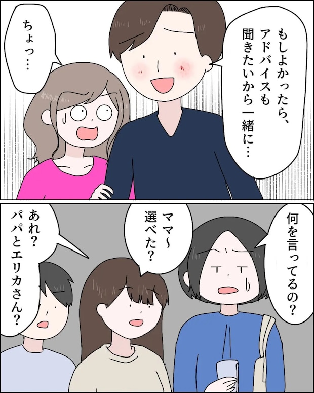 なんとか一緒にいたいと思うあまり「もしよかったら、アドバイスも聞きたいから一緒に・・」とリナさんを誘うケイさん。リナさんが「何を言ってるの?」と呆れていると、「ママ~選べた?」とジュリちゃんとカンタくんがやってきました。
