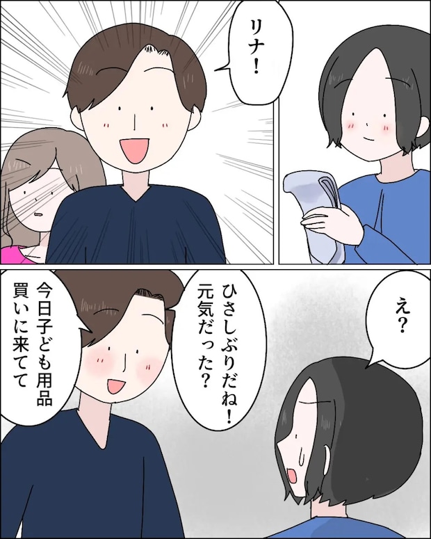 リナさんを見つけたケイさんは、エリカさんが一緒にいるにも関わらず「リナ!」と笑顔で駆け寄ります。「え?」と驚くリナさんに、「久しぶりだね!元気だった?今日子ども用品買いに来てて」と話しかけるケイさん。自分が声をかけたらリナさんは喜ぶと思っている様子。