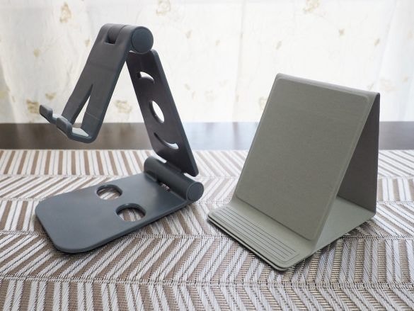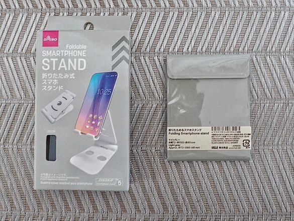 左:ダイソー「折りたたみ式スマホスタンド」、右:無印良品「折りたためるスマホスタンド」それぞれの使い心地と、気になったポイントをあげていきます。