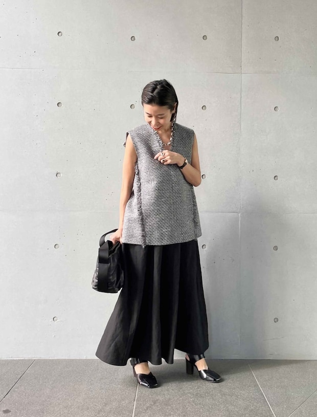 「リネンのドレスは1枚でシンプルに着るのも素敵ですが、今回は一目惚れしたツイードのジレを主役にレイヤード。ファスナーの開閉でボリューム感を変えられるジレは、ドレスのボリュームに合わせて大き目に後ろを開けてみました。キレイな印象になり過ぎないようにあえてスポーティなバッグをプラス」