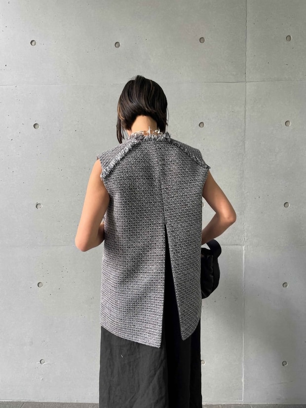 「なんといってもバックスタイルが好き。ファスナーの開閉でバランスを変えたり、インナーや肌見せを楽しんだり……。シーズンや気分によっていろいろ楽しめる点が気に入っています。リュクスなフランス製ファンシーツイードは、キレイ目にはもちろん、デニムなどのカジュアルなアイテムとも相性がいいところも◎」ツイードジレ¥57,200(デパリエ)