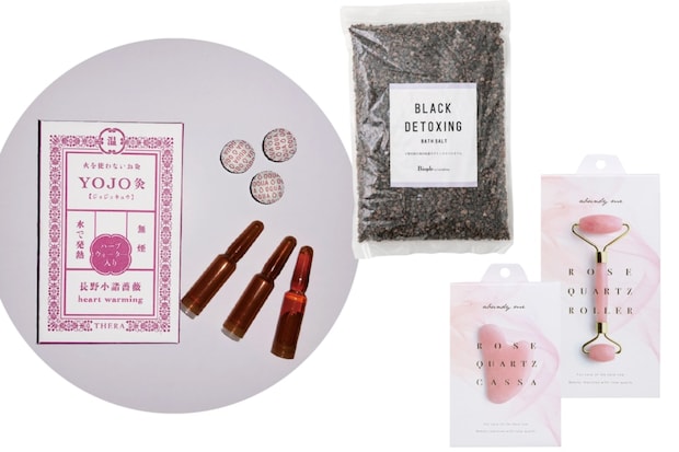左から:火を使わず、煙も発生しないお灸。THERA YOJO灸 長野小諸薔薇 12個 ¥1,800、BLACK DETOXING BATH SALT 1kg ¥1,980、天然石を使用! 右から:abundy me ローズクォーツローラー ¥4,070、同 ローズクォーツカッサ ¥2,640(全てビープル バイ コスメキッチン)