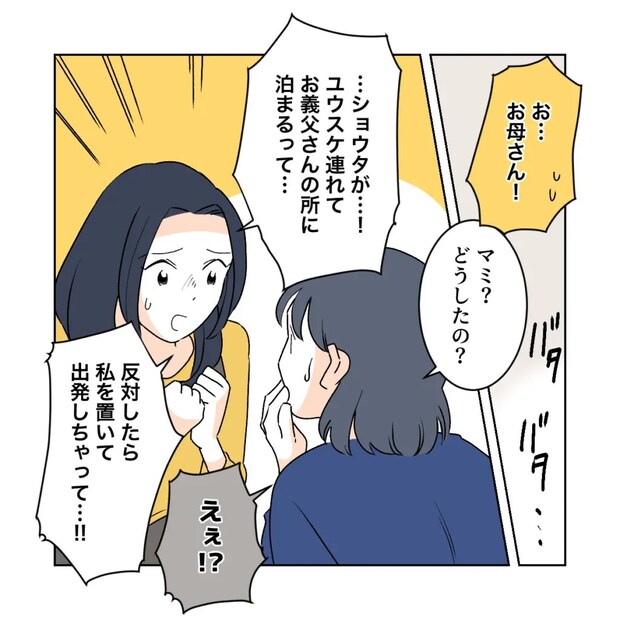 ユウスケくんを連れ、マミさんを一人残して出発してしまったショウタさん。「嘘でしょ!?」と驚くマミさんんは実家でお母さんに事情を話した後、義母にも連絡。義父の連絡先を知っているのは義祖母だけだと、義母に確認をお願いしたマミさんは、ショウタさんが義父のことに執着する理由がわからず考え込んでいました。