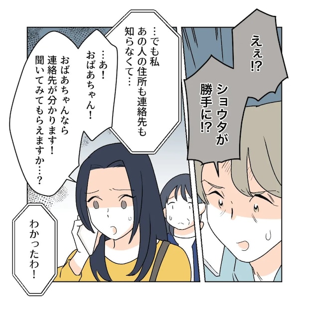「えぇ!?ショウタが勝手に!?」と義母が驚くと、「・・でも私、あの人の住所も連絡先も知らなくて・・」と言われ、「・・あ!おばあちゃん!おばあちゃんなら連絡先が分かります!聞いてみてもらえますか・・?」お願いすると「わかったわ!」と言ってくれました。