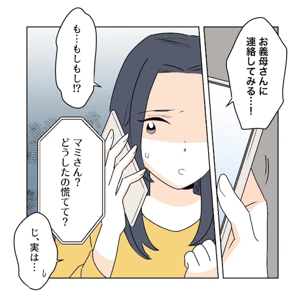 「お義母さんに連絡してみる・・!」そう言ってスマホを取り出し義母に電話すると、「も・・もしもし!?」私の動揺が伝わったのか、「マミさん?どうしたの慌てて?」と義母。「じ、実は・・」と事情を説明すると、