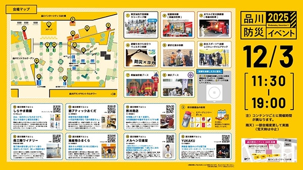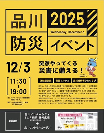 日鉄興和不動産は、品川インターシティマネジメントと協同で、品川インターシティS&R棟前の屋外広場および品川セントラルガーデンにて、12月3日(水)に「品川防災イベント2025」を開催する。