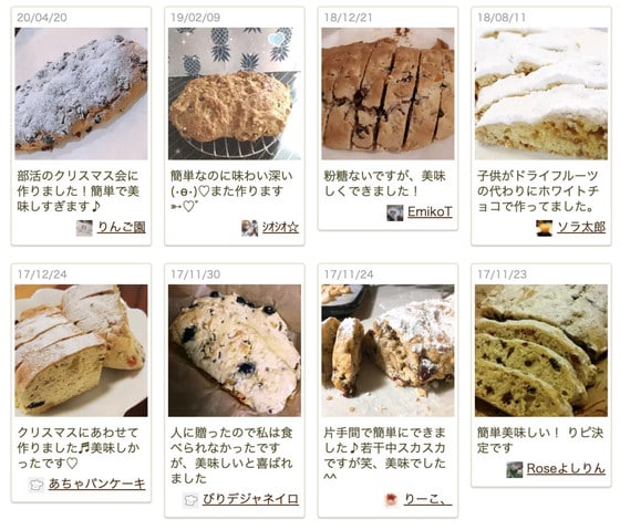 つくれぽ(つくりましたフォトレポートのこと)には「高いシュトーレンが簡単に作れてびっくり!甘さ控えめで子どもにも◎」「初シュートレン!簡単に上手くできて良かったです」などのコメントが届いており、初めてでも手軽に作れると大絶賛。クリスマスに作っている人が多くいましたが、中には「クリスマスじゃないのに作っちゃいました!」なんて人も。