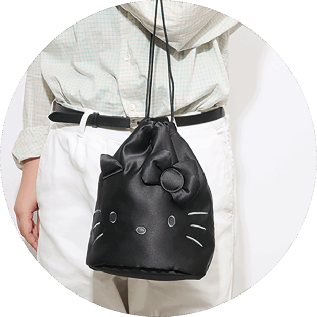 オトナミューズ1月号増刊号の付録は、上品なサテン調素材を使用した高級感たっぷりのフェイス巾着ポーチ。ぷっくりとした耳やリボンがハローキティの可愛さを一層引き立てつつ、どんなスタイリングにも合わせやすいシックなデザインに仕上げました。ポーチ全体に薄手の中綿が入っていてしっかりと自立。ちょっとしたお出かけに持つのにちょうどいい。