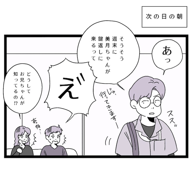 美月さんが家を出て新しい部屋を借りたと知ったタクヤさんは、美月さんが自分の兄カズヤさんと一緒に住むのではないかと疑いました。あり得ないことを疑うタクヤさんに呆れた美月さんは、否定することなく電話を切りました。その後、美月さんにはタクヤさんと義母から何通もメッセージが届きますが、美月さんは無視。翌朝、仕事に出かける間際にカズヤさんが「週末に美月ちゃんが鍵返しに来るって」と言うと、タクヤさんは「え!」と驚き、義母は「どうしてお兄ちゃんが知ってるの!?」と困惑していました。
