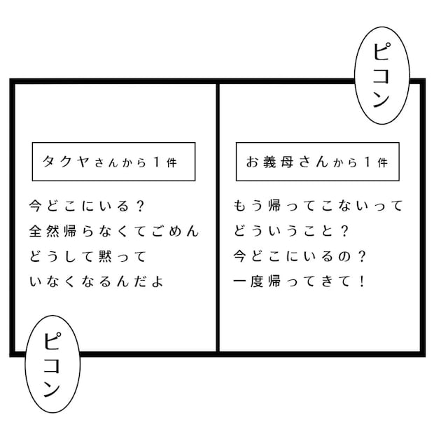 その後、タクヤから話を聞いたようで義母から「もう帰って来ないってどういうこと?今どこにいるの?一度帰ってきて!」とメッセージが届き、タクヤからは「今どこにいる?全然帰らなくてごめん。どうして黙っていなくなるんだよ」と謝罪のメッセージが届きました。