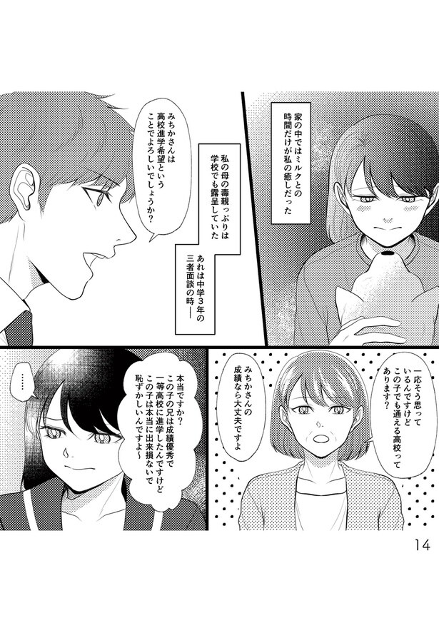 主人公のみちかは、ヒステリックな母に育てられた。父親は単身赴任が多く、母親がみちかをいじめていても見て見ぬふり。優秀な兄も部屋で勉強ばかりしていたため、誰もみちかを助けてはくれなかった。それでも母親に愛されたいと願ったみちかだったが、願いも虚しく、母の行動は日に日にエスカレートしていく。果たして、みちかは無事に毒親から解放される日がくるのか…!?