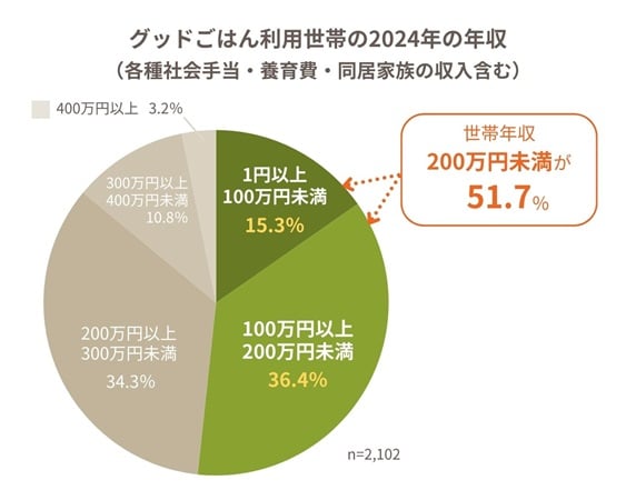 グッドネーバーズ・ジャパンが「グッドごはん」を利用するひとり親家庭を対象に実施した調査では、年収200万円未満の家庭が回答者の約半数を占め、米や肉、野菜の購入が難しいと答える家庭は9割に達しているそう。