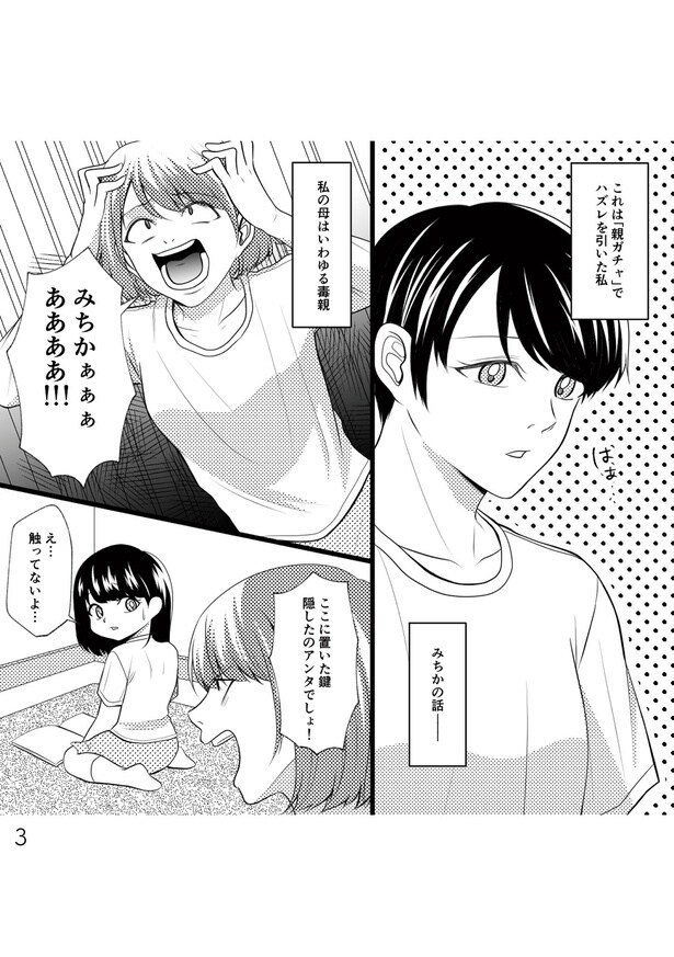「子どもは親を選べない」これは、親ガチャでハズレを引いたみちかの話だ。ヒステリックな母と、母の行動を見て見ぬふりをする父に育てられたみちか。初めて自分の親がおかしいと気付いたのは中学生の時だった…。