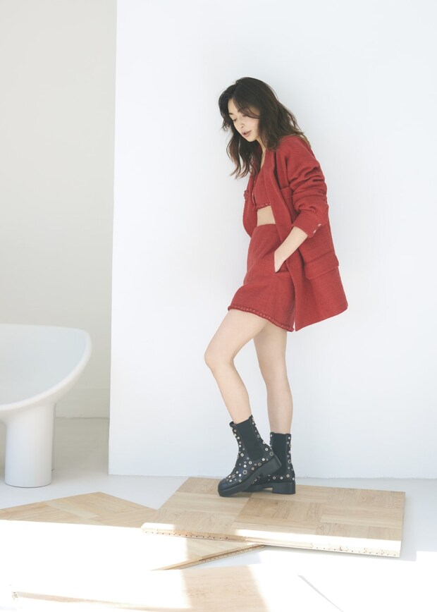フレッシュなエネルギーに溢れた赤いツイードのセットアップは、素肌の存在感が旬度を加速。エッジのきいたブーツとのコントラストあるスタイリングも魅力的。