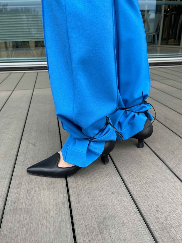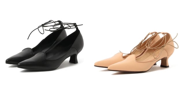 「上品な印象のポインテッドトゥのパンプスに、変形のカッティングディテールを加えてファッション性とモードさも持ち合わせたデザインが気に入っています。アンクル部分のループデザインもスタイリングの足元を女性らしく華奢に演出してくれます。パンツの上から紐を結んで着こなしのアクセントに」