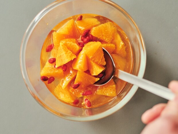 ④オレンジシロップを作る。オレンジは皮をむき、果肉を取り出して2㎝大に切る。ボウルに水100g、グラニュー糖を入れ、ゴムべらで混ぜて溶かす。オレンジの果肉、ディタ、クコの実を加えて混ぜ、冷蔵室で15分以上冷やす。