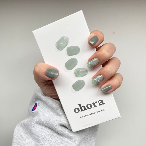 使用したのは、韓国生まれのジェルネイルブランドohoraのシールタイプのジェルネイル。韓国文化からインスパイアされたという『k-ohora』コレクションより、青磁の美しさを表現したセラドンネイルをセレクトしました。少しくすんだグリーンは陶器のようなツヤ感が素敵。マーブル柄にさりげなく入った金箔で、程よく主張もしつつ上品な指先に。