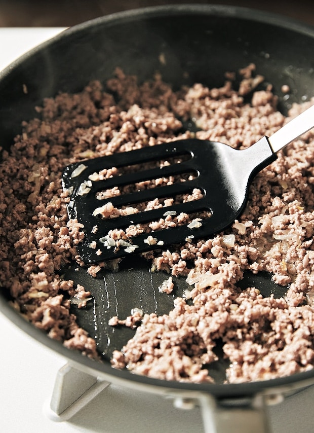 ①ひき肉を炒める