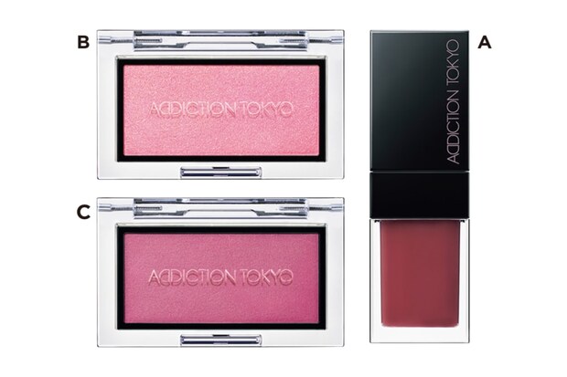 A_みずみずしさ溢れるモーヴプラム。なじませるだけで唇が縦ジワごとふっくら。リップ オイル プランパー Glowy Mauve ¥3,300 ※4/22発売、B_透明感いっぱいの愛らしいピンク。ザ ブラッシュ ニュアンサー Pink Bliss、C_柔らかなベリーパープル。同 マット Orchid Dusk 各¥3,300(全てアディクション ビューティ)