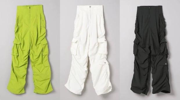 高めに設定したウエスト位置で、ウエストからヒップにかけてはスッキリしているので、ボリュームはありながらも、スタイルアップして見せてくれる。ワッシャー加工された生地でカジュアルな印象に。撥水加工、花粉防止加工を施した、リサイクルナイロン使用のサステナブル素材が嬉しい。パンツ各¥7,000(全てジーナシス)