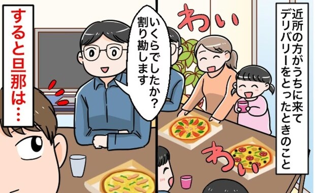 近所の方と自宅に集まり、家族ぐるみで遊んでいた投稿者さん。デリバリーを取ることになって、金額は4000円ほどになり、相手方から割り勘を申し出てくださったようです。しかし、夫がその申し出を断り、投稿者さん家が全額負担することになったようです。