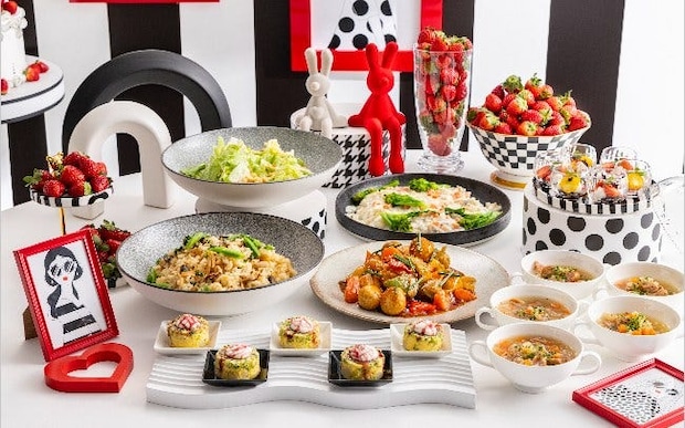 「チェリートマトとモッツァレラ バルサミコジュレとストロベリーパール添え」や「ブロッコリーとポテトのフリッタータ クリームチーズとザクロモラセス」などの前菜に加え、「スイート&サワーミートボール 春野菜添え」や「白身魚のベイク クラムチャウダーソース」、「筍ときのこの炊き込みご飯」などが用意されているので、スイーツの合間の箸休めとしてはもちろん、遅めのランチとしてもおすすめ。