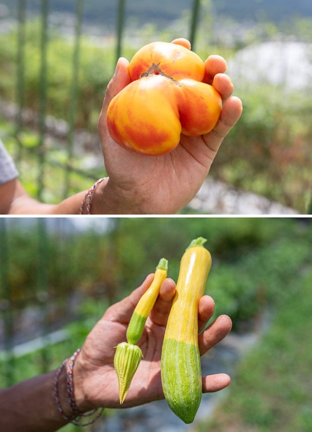 ディナーの準備をするシェフのタシ・ジャムツォさんの姿は、太陽が照りつけるENOWA FARMにありました。畑には色とりどりの野菜や果物、ハーブなどが植えられています。タシさんはひとつずつ触り、香りを嗅ぎ、ときにひょいと口に入れて確認し、収穫していきます。「パイナップル」という名前のトマトや、UFOのような形のズッキーニ。真っ黄色の唐辛子に、スーパーでは見かけないツルムラサキの若芽や花。畑は、見たことのない野菜やハーブの宝庫です。みるみる間に、かごは珍しい作物でいっぱいに。なにせ、トマトだけで20種類、ズッキーニは6種類と、年間約250品種もの多品種の作物が育てられているのですから。