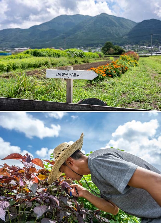 上/ENOWA FARMでは、一流の料理人に愛される京都・石割農園の石割照久さんの指導のもと、野菜作りをしてる。宿泊客は見学も可能 下/故郷のチベットでは母の畑の手伝いをしていたというシェフのタシさん。畑で野菜を見て、その日のメニューを決めていく
