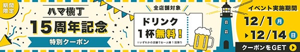 「ハマ横丁」公式サイト公開を記念して、12月1日(月)~14日(日)には、全店舗共通の「ドリンク1杯無料クーポン」を配布中。クーポンは公式サイトから取得することが可能で、地域の人たちへの感謝を込めた“還元キャンペーン”として誰でも利用できる。注文時にクーポン画面を店舗スタッフに提示すると、店舗指定の対象ドリンクが1杯無料となる。なお、利用はいずれかの店舗で1人1回限り。他サービスとの併用不可で、利用の際にはフードまたはドリンク1品を注文する必要がある。