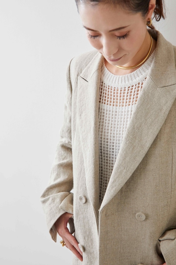 「風合いのあるリネンジャケットにメッシュニットドレスを合わせ、ドライタッチなアイテムでまとめて、春らしい清涼感のあるコーディネートにしました。カジュアルな印象にならないようジュエリーはゴールドを、足元は今季トレンドのプラットフォームサンダルをセレクト」