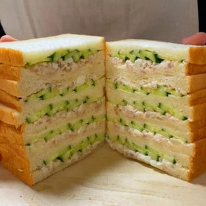 食パンにはさみます。このとき、きゅうりやレタスなどの野菜を合わせると彩り良く仕上がります。