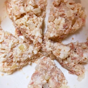玉ねぎ、ツナ、はんぺん、調味料を混ぜたら5等分にします。