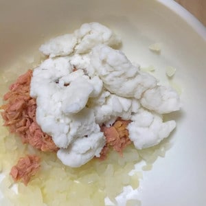玉ねぎをレンジで加熱し、ツナ、はんぺんと混ぜます。はんぺんを使用することで、おいしくボリュームアップ!ツナ缶1つで作れる理由は、はんぺんを合わせているからです。