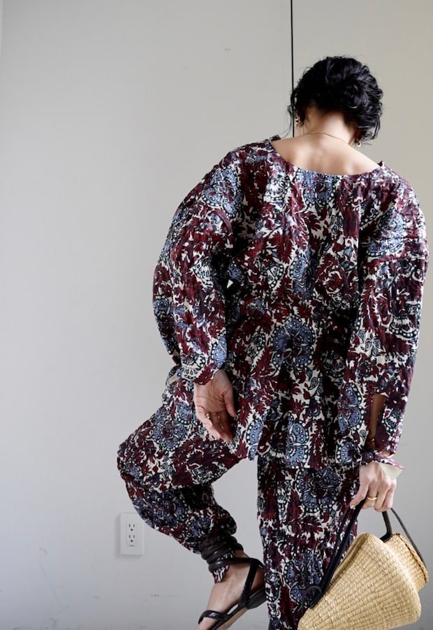 「暖かくなると着たくなるプリントアイテム。プリント地に刺繍が施された立体感のあるアイテムをセットアップでコーディネート。アイテムごとの印象も強いので、裾やウエストのポイント、小物での全体のバランスを意識しました。花柄だけど甘過ぎないシャープな印象を与えてくれるところもお気に入りです」