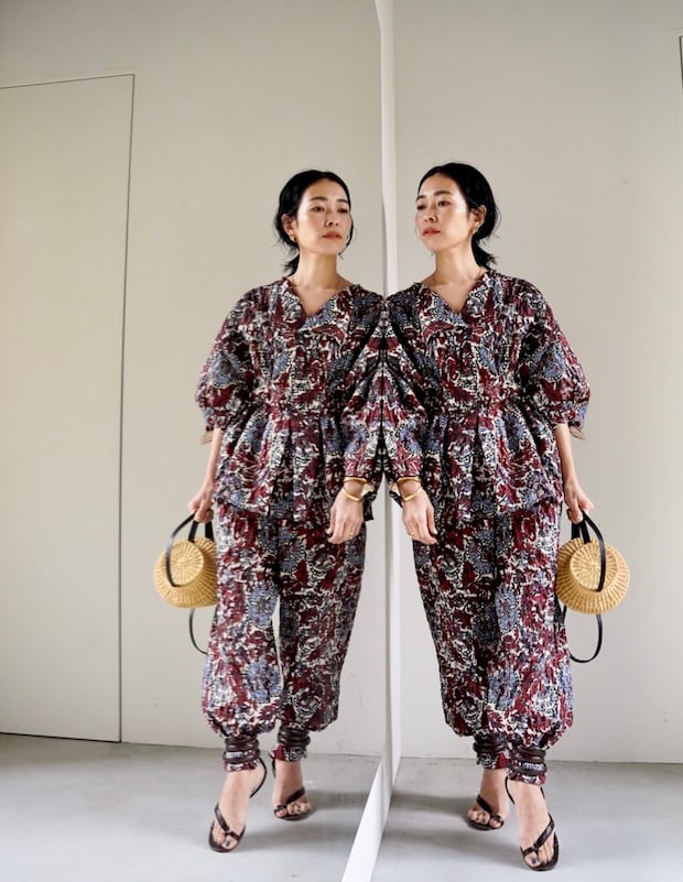 トップス¥42,900、パンツ¥36,300(共にミュラーオブヨシオクボ)、INES BRESSANDのバッグ、BOTTEGA VENETAのサンダルは本人私物