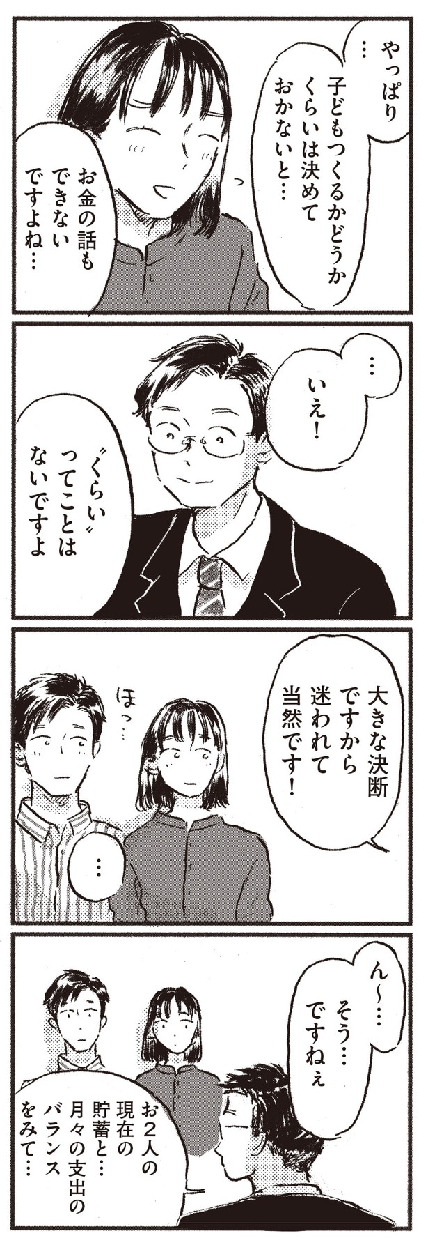 2025年12月2日 【漫画】「一緒に子どもを育てたい」FPの生涯設計をきっかけに、夫が話した本音/子どもが欲しいかわかりません(19) WEBザテレビジョン フリーライターのカナコは、マッチングアプリで出会ったリョウと結婚して5年目。今まで心から「子どもが欲しい」と思ったことは無かったが、「高齢出産」と呼ばれる年齢に差し掛かったことで、気持ちと向き合うことに。友人や家族、夫との会話を通して、カナコは「自分にとっての幸せ」について考えていく…。 子どもの有無を手がかりに様々な幸せと出会っていくコミックエッセイ、「子どもが欲しいかわかりません」(著・大町テラス)から、全23回連載でお届け。今回は第19回となる。