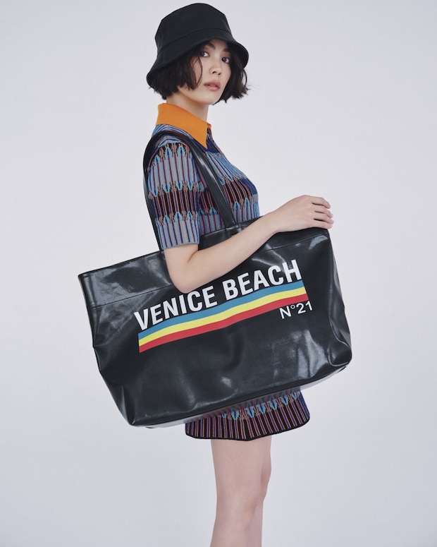 バッグ¥39,600(ヌメロ ヴェントゥーノ/イザ)、プルオーバー¥105,600、ミニスカート¥83,600(共にトッズ/トッズ・ジャパン)、ハット¥16,500(シシ)