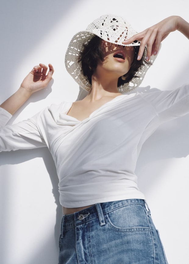 プルオーバー¥15,400(ラインバイケイ/ウィム ガゼット ルミネ新宿店)、デニムパンツ¥25,300(ラブレス/ラブレス青山)、ハット¥14,300(メゾンドリリス/ギミックス)、ピアス¥35,200(モダンウィーヴィング/ショールーム セッション)
