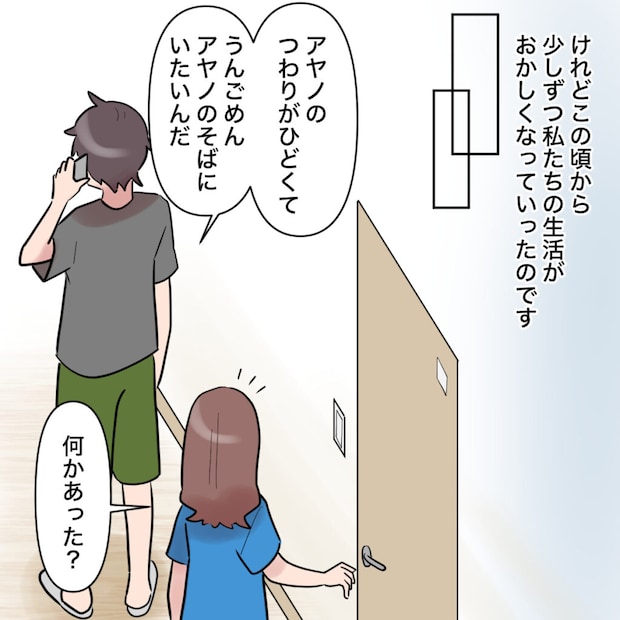 「アヤノのつわりがひどくて・・うん、ごめん。アヤノのそばにいたいんだ」電話で話すトモヤの後ろから、「何かあった?」と聞くと、