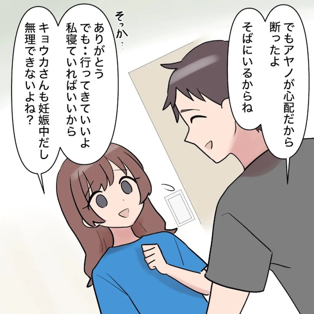 「でもアヤノが心配だから断ったよ。そばにいるからね」そう話すトモヤに、「そっか・・ありがとう。でも・・行ってきていいよ。私寝ていればいいから。キョウカさんも妊娠中だし、無理できないよね?」と言うと、