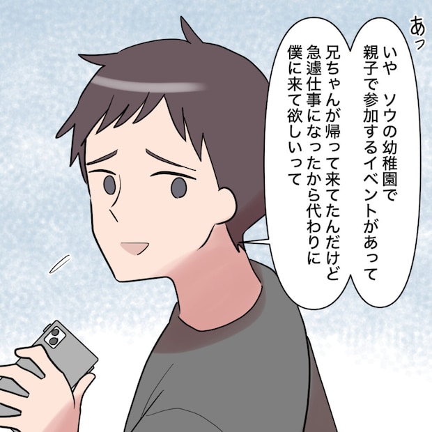 「あっ・・いや、ソウの幼稚園で親子で参加するイベントがあって、兄ちゃんが帰って来てたんだけど、急遽仕事になったから代わりに僕に来て欲しいって」とトモヤが言い、