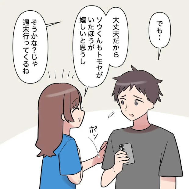 「でも・・」と躊躇するトモヤに、「大丈夫だから。ソウくんもトモヤがいたほうが嬉しいと思うし」そう言ってトモヤの腕をポンと触ると、「そうかな?じゃ週末行ってくるね」と申し訳なさそうにトモヤが言いました。