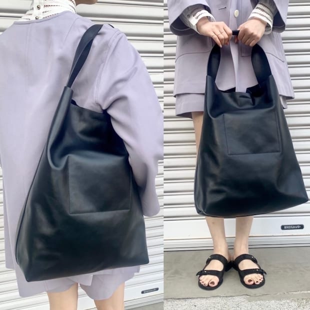 「セットアップと同じぐらい今気に入っているのが、MARLOTAのイエナエクスクルーシブのバッグ。軽く滑らかなレザーは使いやすさも抜群。容量もたっぷり入るので、通勤やショッピングにも便利です。どんなコーデにも合わせやく、上で着ているセットアップにもよく合わせています」レザーバッグ¥46,200(マルロタ/メゾン イエナ)