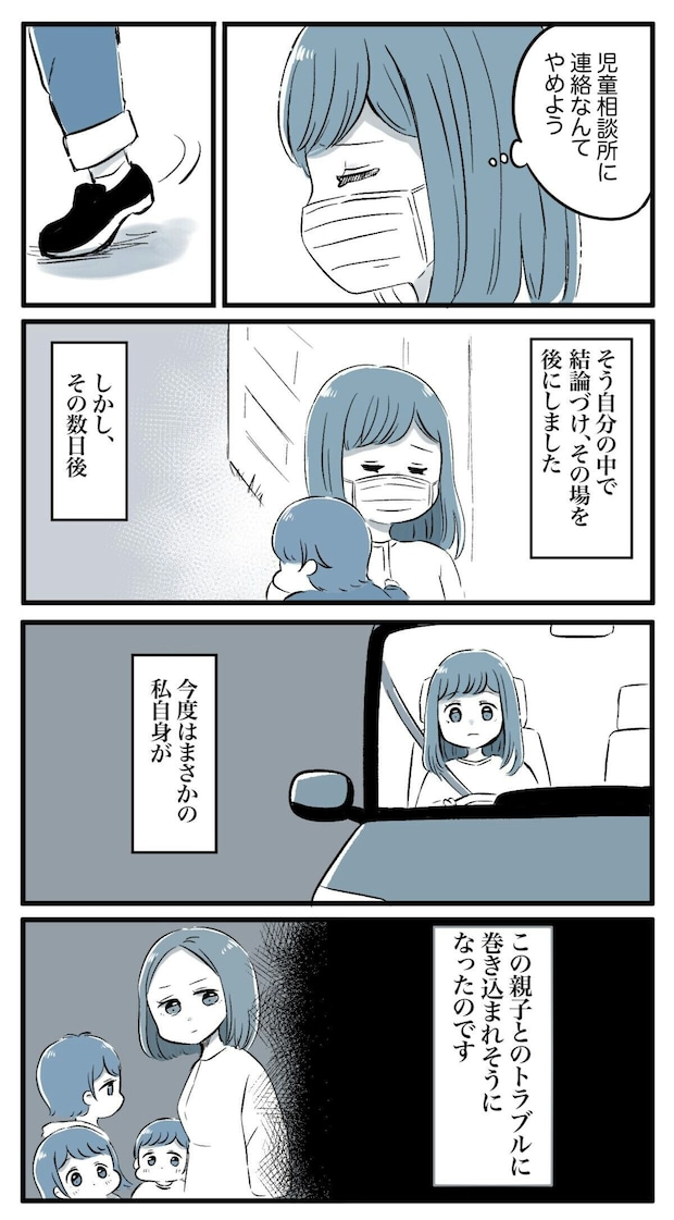 両親ともが子どもを虐待しているのだとしたら、家庭に子どもたちの逃げ場はないのでしょう。なんとか助けてあげたいとは思うものの、相手の敵意が自分やわが子に向けられたらと思うと、決心できない葛藤があったようです。こんな場面に出くわしたとき、あなたならどうしますか?